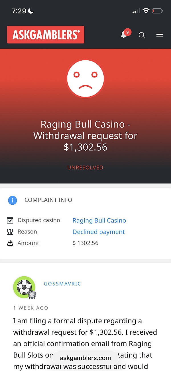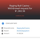 I filed a complaint against Raging Bull Casino through AskGamblers after the casino refused to honor a confirmed $1,302 withdrawal. I had clear screenshot evidence of the casino's own promotional email explicitly stating "no playthrough or max cashout limit" — yet the casino rep denied this language existed in my evidence. AskGamblers closed my complaint in the casino's favor without properly addressing this contradiction or giving me a chance to respond with my screenshots.