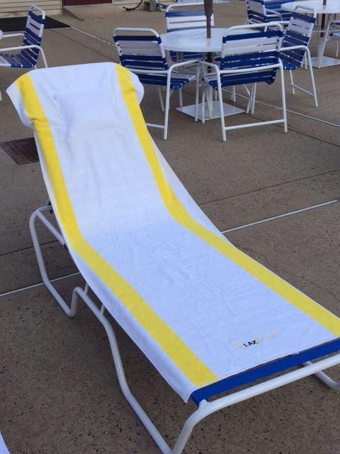 LazeTowel is a luxury beach towel with an sewn-in headrest that securely fastens to the top of a lawn/lounge chair. Drawstring backpack & pillow included.