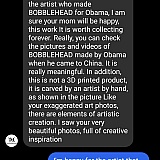 I placed an order for a father's day bobble head for my husband. I sent a side profile picture so they can see his hairstyle (he always wears hats) and immediately contacted them asking can I send a frontal for them to use. They replied right away and said to send the picture. The artist used the side profile picture and said if I wanted to use the frontal it will cost extra and that they will just do a little editing to it. With no other choice since I wasn't paying more I agreed. I paid $9.99 for a gift box that was completely taped up and ruined upon removing the tape. I paid $4.99 for custom text that was written in sloppy sharpie hand writing that doesn't fit properly on the front. The color of the outfit didn't match the advertisement or the body. I contacted them with picture proofs and they replied the first time then completely ignored me after. Would never recommend them! Don't order from this site! You will not be happy with your custom bobblehead!