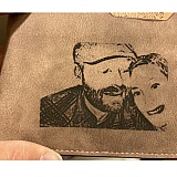 The photo isn't engraved like it is supposed to it is a picture printed on the wallet very faint a the words that we had put on the back is wrapping around the wallet. It is cheaply made an very unhappy with it.