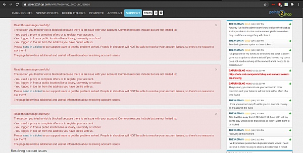 This site is a total nightmare, I was lucky to be on here for 2 and a half months and earned enough for 4 amazon gift cards worth $50 apiece, my quality score was close to 400 with their my survey brand of surveys, until on 1/23/2018 at approximately 9:35 AM that morning, I was axed by their ban axe, never have felt such frustration and pain, this site needs to be shut down for deception and cruel practices, I was even following all rules and they claimed that I hacked in points to my account, well I hope they enjoyed kicking me out for life and eternity, they may have the power to banish me from their site, but they cannot banish my soul, that is property of Christ or Satan, the first I want to give my soul to not the later, these clowns will not answer their email or facebook page either I would also like to know how they find out how you can look into a person's room and find out what they are typing?, yes I am talking to you Points2Shop, until you clean up your ways and stop being ban happy I might reconsider.