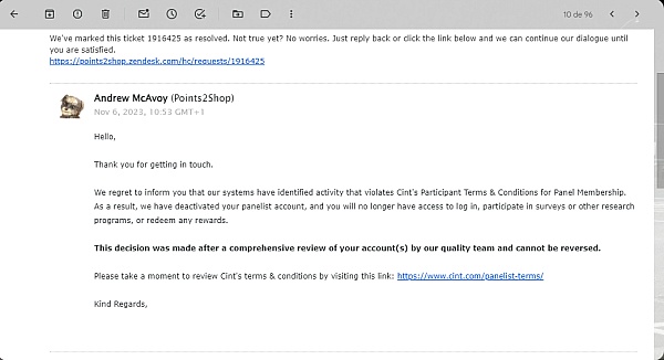 We regret to inform you that our systems have identified activity that violates Cint's Participant Terms & Conditions for Panel Membership. As a result, we have deactivated your panelist account, and you will no longer have access to log in, participate in surveys or other research programs, or redeem any rewards.